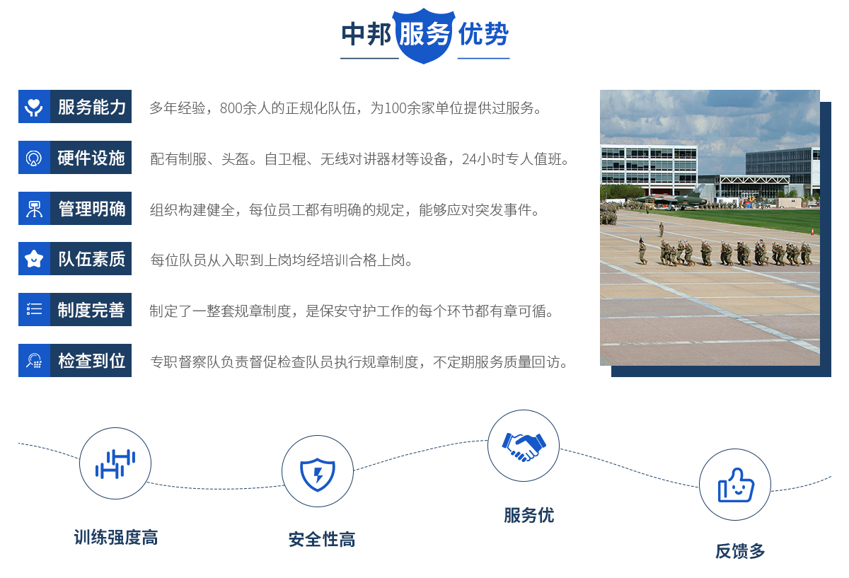 中邦服務(wù)簡介 安徽中邦保安服務(wù)有限公司總公司成立于2019年。公司 成立以來,始終以“文明值勤、優(yōu)良服務(wù)、客戶至上、安全為先” 為宗旨,以保一方平安為已任,面向社會各界等提供有償保安護(hù) 衛(wèi)、技術(shù)防范、保安培訓(xùn),是一家專業(yè)化保安服務(wù)公司。目前, 公司下為200多家客戶單位提供周到安全的保安服務(wù),遍布全省 及周邊地區(qū),現(xiàn)有各類專業(yè)人員和保安員2000余名。 中邦服務(wù)宗旨 安徽中邦保安服務(wù)有限公司是為適...